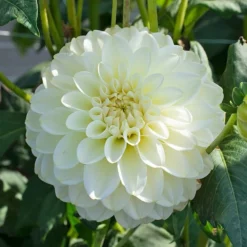 Dahlia ‘White Perfection’ shows off giant 8–10″ blossoms of crisp white with a touch of radiant yellow glowing at the centers. Decorative form.