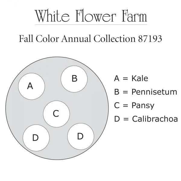 Refresh your patio containers for fall and enjoy an extended display of vibrant blooms and textured foliage. Our colorful collection includes bicolor Pansies, which defy frost and continue to bloom for weeks, and an Ornamental Kale, which intensifies its color throughout autumn and into winter. The burgundy blades and burnished plumes of Purple Fountain Grass add color and movement early in the season, with Calibrachoa blossoms contributing bright pops of orange. 2 plants of the Calibrachoa and 1 each of the others, 5 plants total. Container not included.