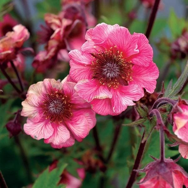 Offering a burst of color in early spring and blossoming nonstop into early summer is showy Geum Tempo™ Rose, which produces a profusion of ruffled, richly detailed dark rosy-pink flowers on short, burgundy stems above a mound of lobed, serrated green leaves. The foliage makes a fine ground cover over a long season. The deer-resistant plants are nicely sized for the edges of sunny borders where they will attract butterflies. The blossoms, fresh or dried, add intriguing color and pattern to bouquets. ‘TNGEUTR’ PP 31,209
