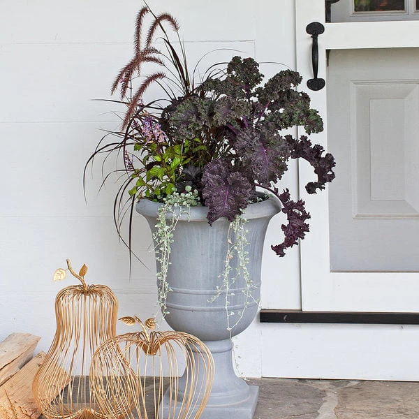 Dramatic shades of an October evening combine in a standout collection that mixes four different annuals with one perennial for fall. The dark, frilly, purple-black leaves of annual Kale ‘Redbor’ and the graceful burgundy foliage and garnet plumes of Ornamental Grass Pennisetum ‘Rubrum’ stand tall amid the midnight-purple leaves of mounding perennial Heuchera ‘Obsidian.’ The purple is repeated in the dark green and purple-black foliage of Plectranthus ‘Mona Lavender’, which adds lavender flowers for a long show. The small silvery leaves of cascading annual Dichondra argentea ‘Silver Falls’ add a shimmering gleam like moonlight. The Heuchera is perennial in zones 4 to 9S/W, and it will return year after year. 1 plant of each for a total of five plants.