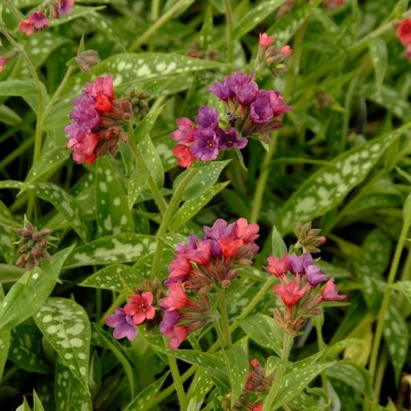 The attractive raspberry-pink blooms of Pulmonaria ‘Raspberry Splash’ appear early, but the brilliant silver-spotted leaves and upright habit are what make this an exceptional Lungwort. A cross between P. longifolia ‘Bertram Anderson’ and P. rubra ‘Barfield Pink.’ PP 12,138