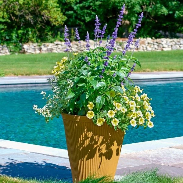 With a cheerful color palette that captures the essence of summer, our Sun & Sky Annual Collection recreates the sunshine and blue skies of the season. At the heart of this sun-loving collection are two plants of the upright, heat tolerant Salvia Mystic Spires. Adored by pollinators and hummingbirds, the clear blue-violet flower spikes point skyward above attractive, deep green foliage. At their base, Argyranthemum frutescens ‘Butterfly,’ a floriferous mounding form of Marguerite Daisy, and Petunia Bees Knees, with colorfast golden honey blossoms that mound and trail, produce sunny orbs that positively glow from spring through frost. Weaving among them, two Licorice Plants (Helichrysum petiolare ‘Variegatum’) shrug off dry conditions and send forth felted, gray-green leaves that beautifully reflect the sun’s rays.