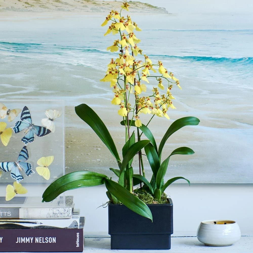 The delicate, airy blossoms of the Sweet Sugar Oncidium Orchid appear on central spikes and secondary stems in a cloud of sunny yellow with orange and chestnut highlights. We ship two fully-budded Oncidium orchids in a 6″ square ceramic cachepot.
